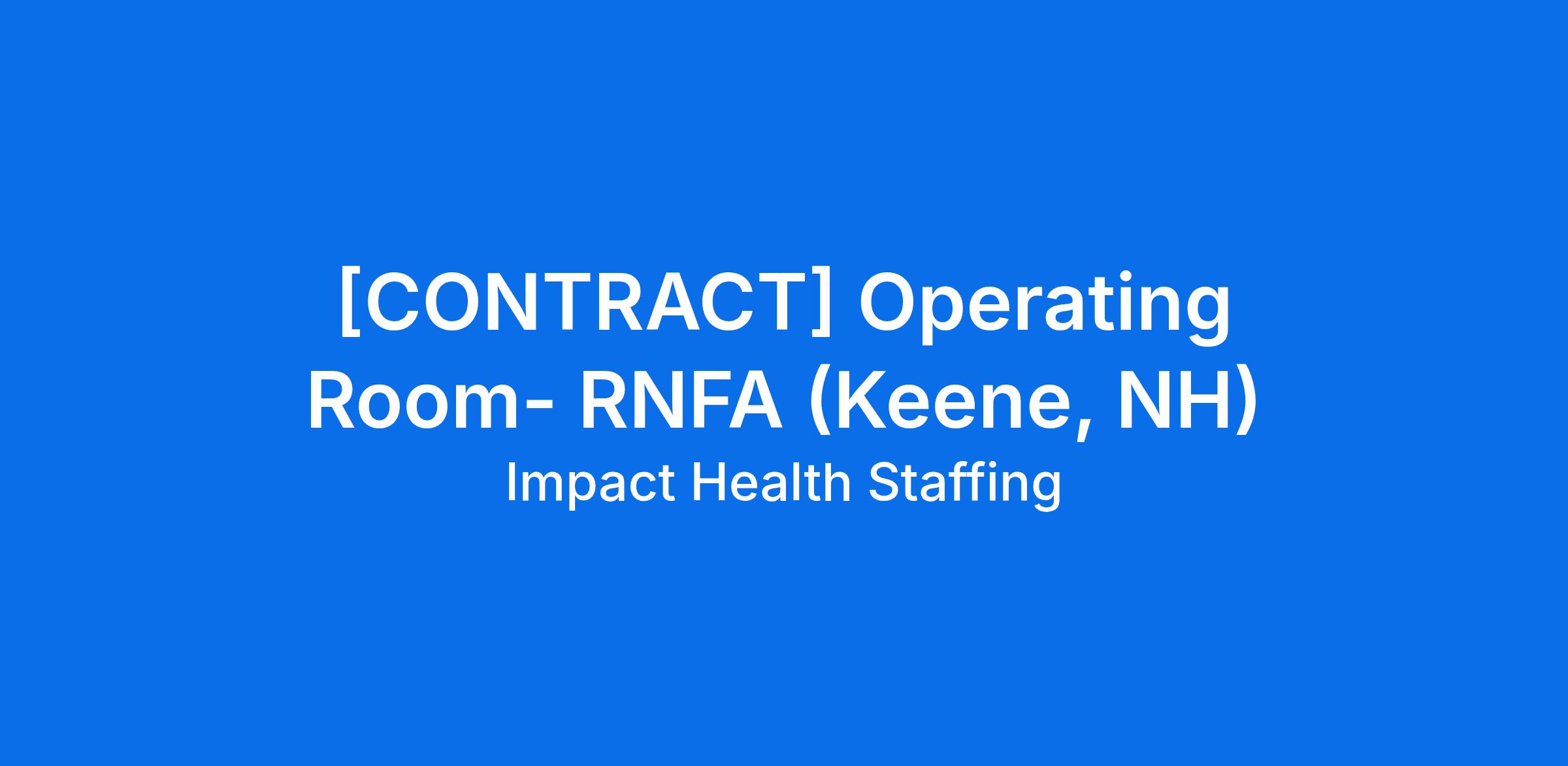 Are you an Operating Room First Assist RN looking to do your best contract work in Keene, NH? If so, Impact Health Staffing is here to help! We are working with a client that is in need of an amazing RNFA for a 13 week contract in Keene, NH!