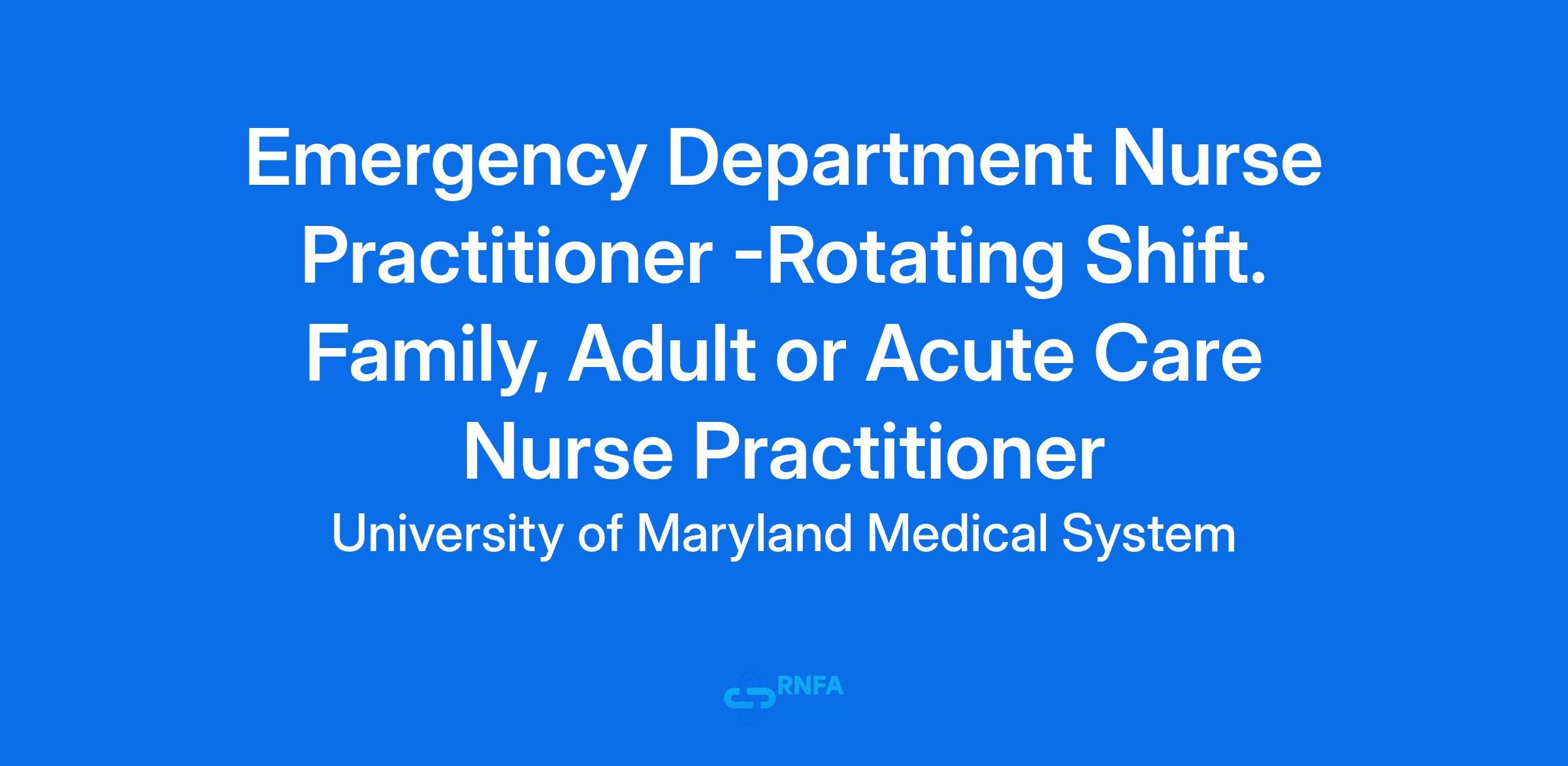 This position is working in our Downtown Baltimore Emergency Department. Looking for an Experienced Advanced Nurse Practitioner to join our team! Will consider RN's with ED experience.