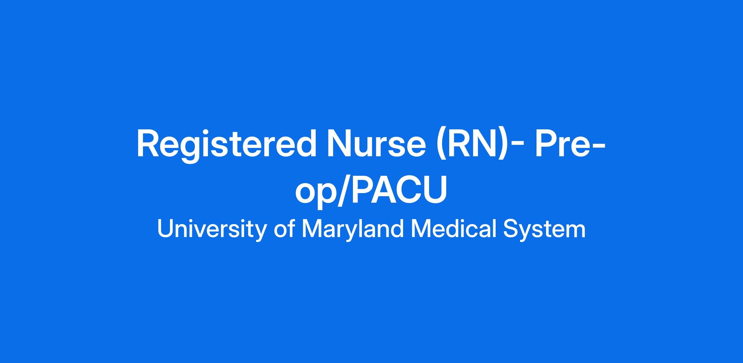 Education & Training: Graduate of an accredited school of nursing, Bachelors preferred. Currently licensed as an RN in the State of Maryland. BLS and ACLS required, PALS required for PACU and Pre-Op nurses within six months of hire. Additional certification and/or training as determined by department per job task list.
