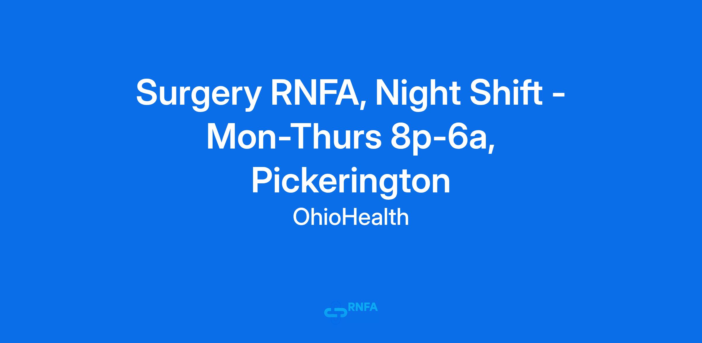 Associate's Degree (Required)CNOR - Certified Nurse Operating Room - Competency & Credentialing Institute (CCI), RNFA - Registered Nurse First Assist - Competency and Credentialing Institute, RN - Registered Nurse - Ohio Board of NursingAdditional Job Description: