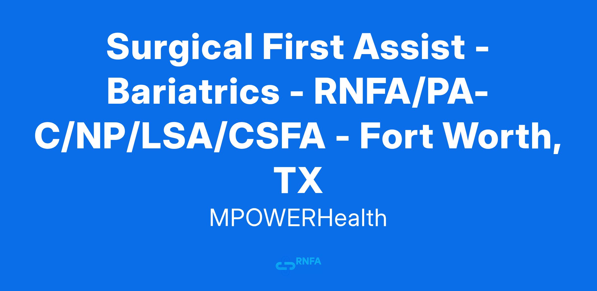 MPOWERHealth is seeking a highly skilled Surgical First Assist with bariatrics experience to join our team in Dallas-Fort Worth, TX. We are looking for a dedicated professional with OR experience and one of the following credentials: RNFA/PA/NP/LSA/CSFA (with ability to get LSA). As a Surgical First Assist, you will play a critical role in the success of our surgical procedures. This position is exclusively OR-based, with no clinic or rounding responsibilities.