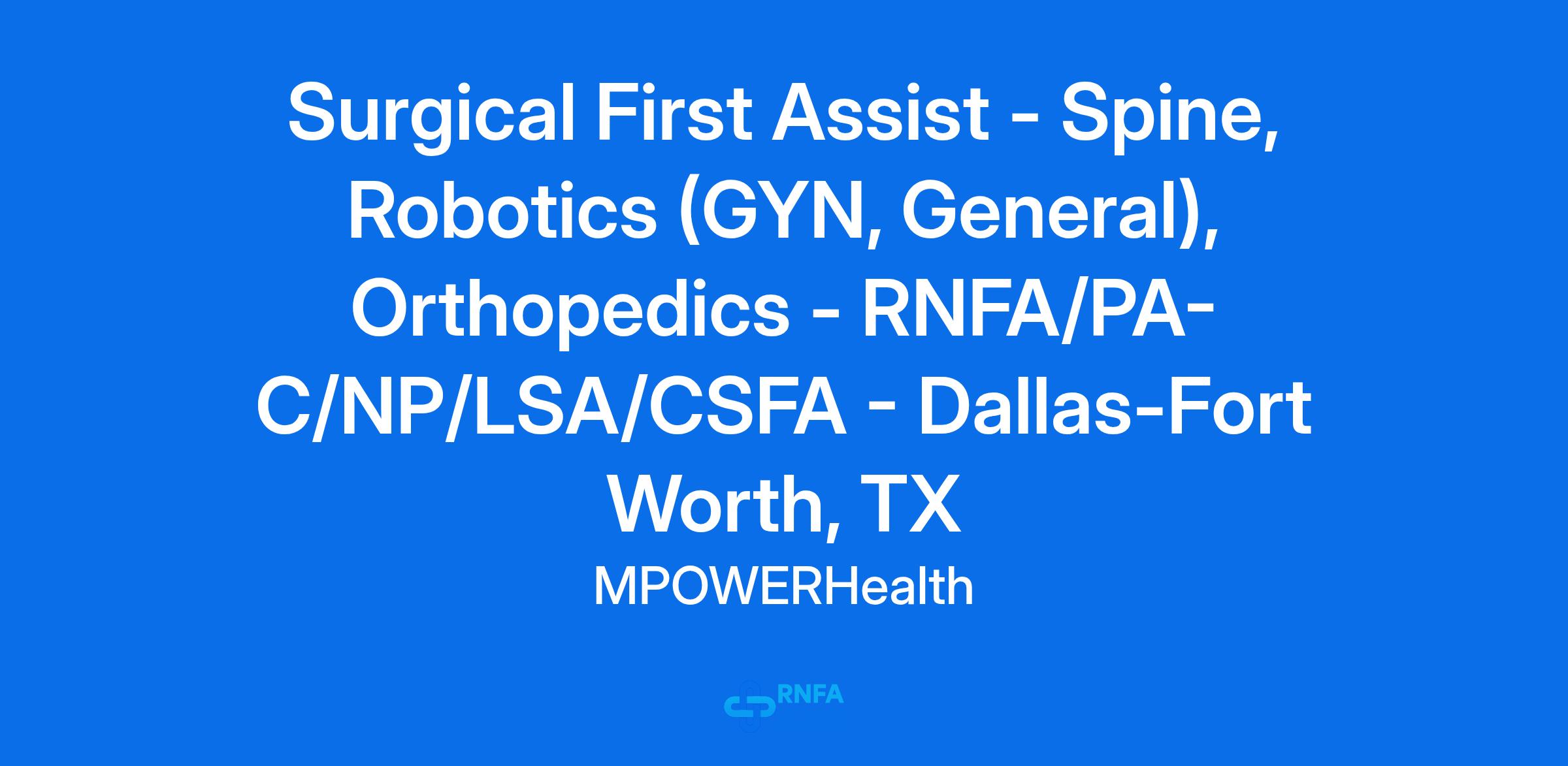 MPOWERHealth is seeking a highly skilled Surgical First Assist to join our team in Dallas-Fort Worth, TX. We are looking for a dedicated professional with OR experience and one of the following credentials: RNFA/PA/NP/LSA/CSFA (with ability to get LSA). As a Surgical First Assist, you will play a critical role in the success of our surgical procedures. This position is exclusively OR-based, with no clinic or rounding responsibilities.