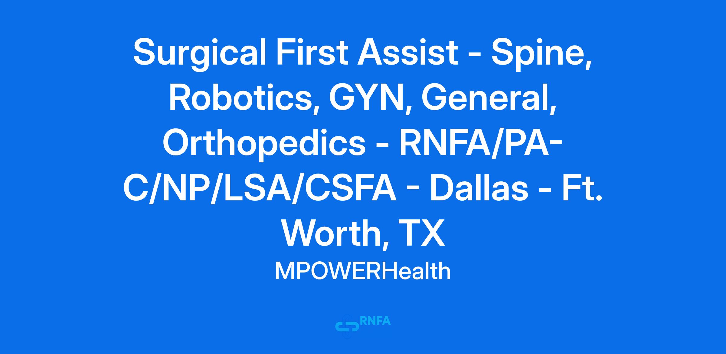 MPOWERHealth is seeking a highly skilled Surgical First Assist to join our team in Dallas-Fort Worth, TX. We are looking for a dedicated professional with OR experience and one of the following credentials: RNFA/PA/NP/LSA/CSFA (with ability to get LSA). As a Surgical First Assist, you will play a critical role in the success of our surgical procedures. This position is exclusively OR-based, with no clinic or rounding responsibilities.